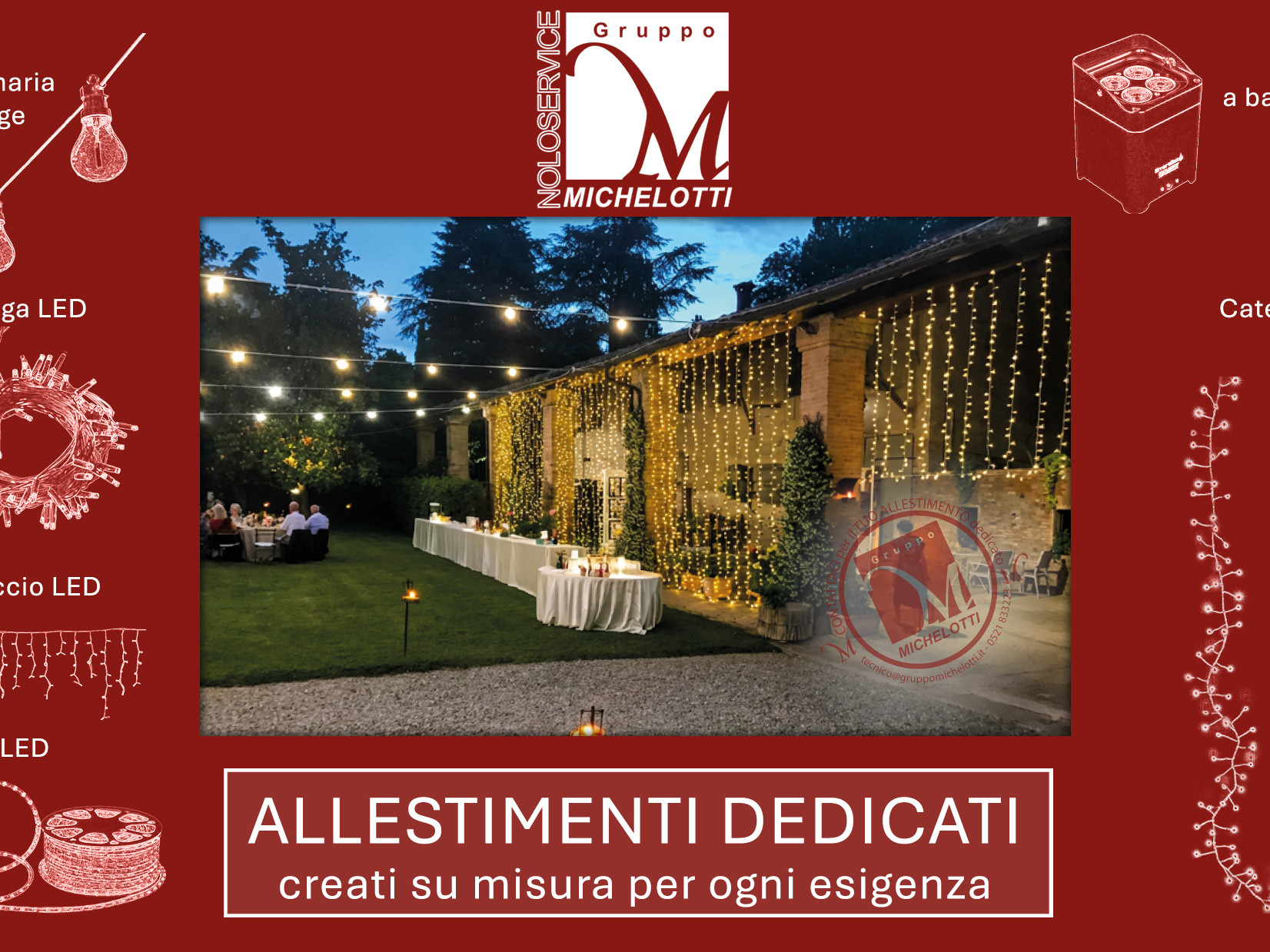 Da oltre 30 anni il nostro gruppo offre servizi di noleggio di attrezzature e di strutture per eventi. Oggi siamo il riferimento affidabile e professionale per chi organizza eventi, cerimonie e manifestazioni. Dai wedding planner, alle aziende di catering, dalle associazioni alle aziende: per ogni evento forniamo allestimenti di qualità e in linea con le tendenze del design.