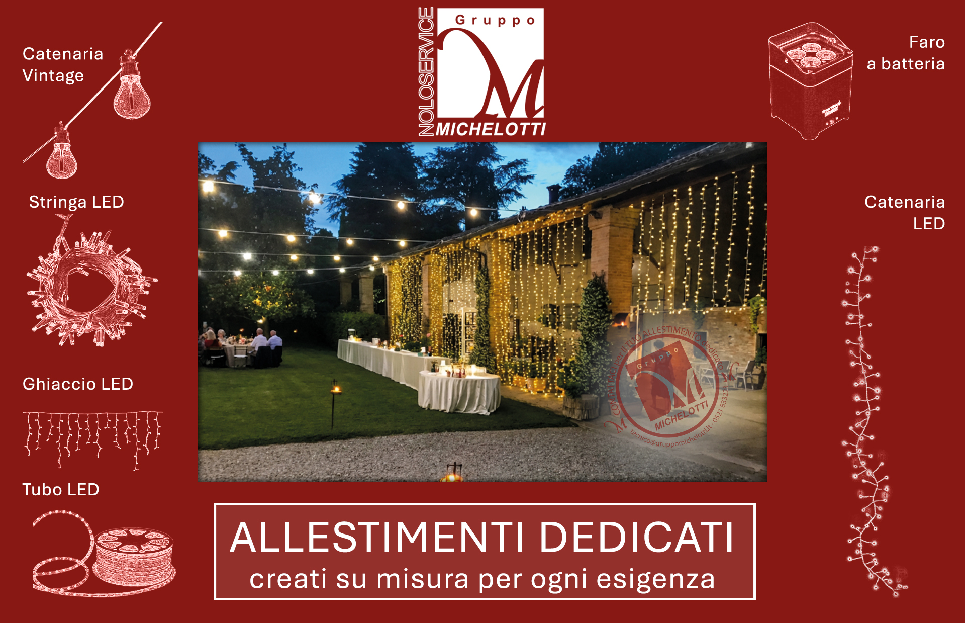 Da oltre 30 anni il nostro gruppo offre servizi di noleggio di attrezzature e di strutture per eventi. Oggi siamo il riferimento affidabile e professionale per chi organizza eventi, cerimonie e manifestazioni. Dai wedding planner, alle aziende di catering, dalle associazioni alle aziende: per ogni evento forniamo allestimenti di qualità e in linea con le tendenze del design.