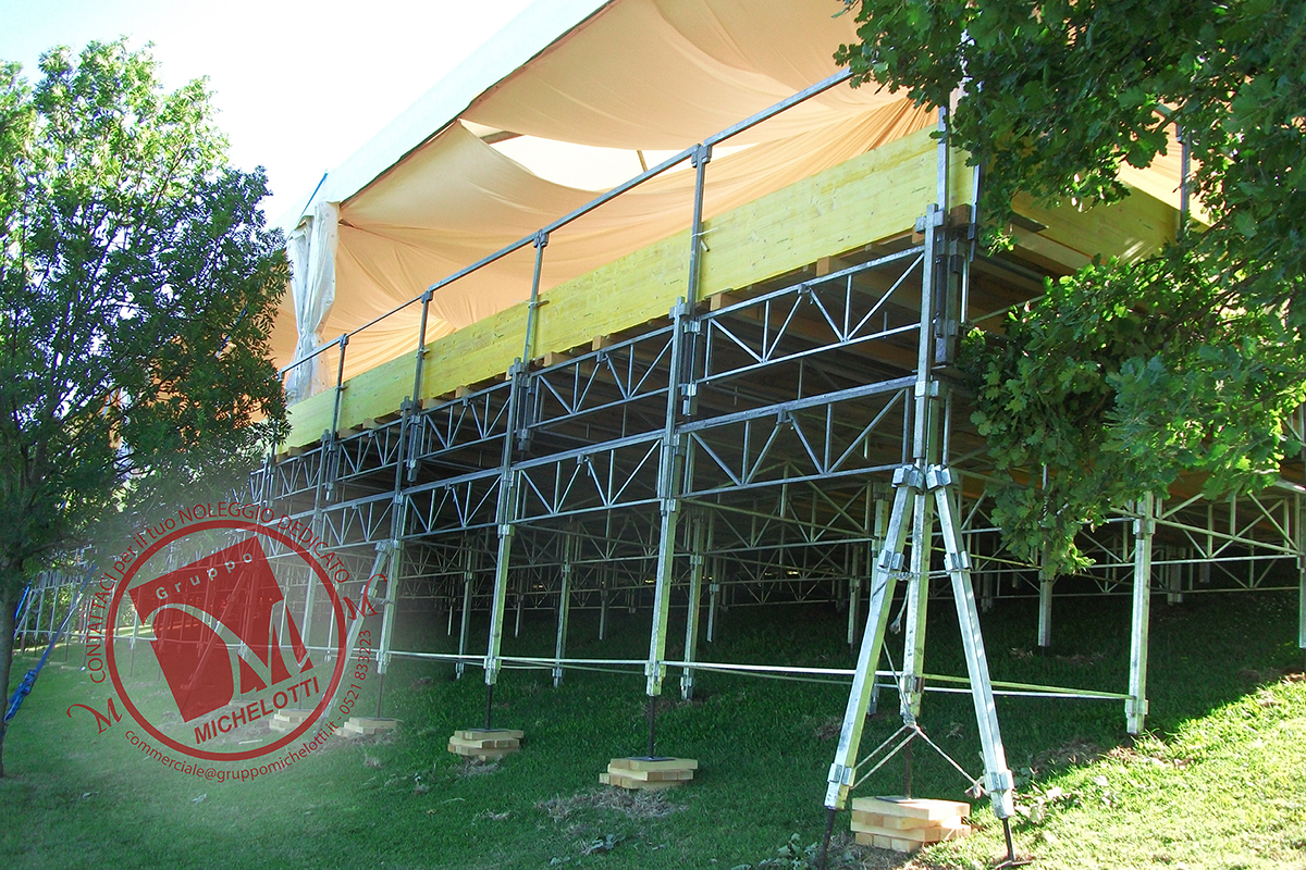 Grazie ad un modulo base di 2×1,6m i nostri palchi consentono di articolare l’allestimento in qualunque dimensione o forma. I piedi telescopici ed autolivellanti consentono il montaggio della struttura su terreni scoscesi, superfici con elevate pendenze o addirittura su scalinate.