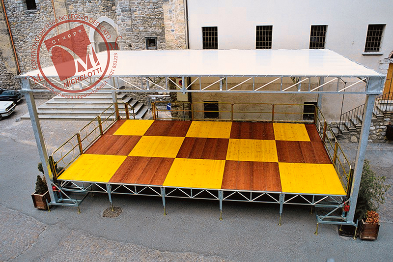 Disponibili in varie dimensioni, il palco per spettacoli ha una altezza che può variare da 98 a 155cm nella sua versione alta ed è ideale per concerti, spettacoli e conferenze. Nella seconda versione presenza un’altezza da 50 a 75cm e rappresenta una soluzione adeguata per sfilate, piano bar o piani rialzati in genere.