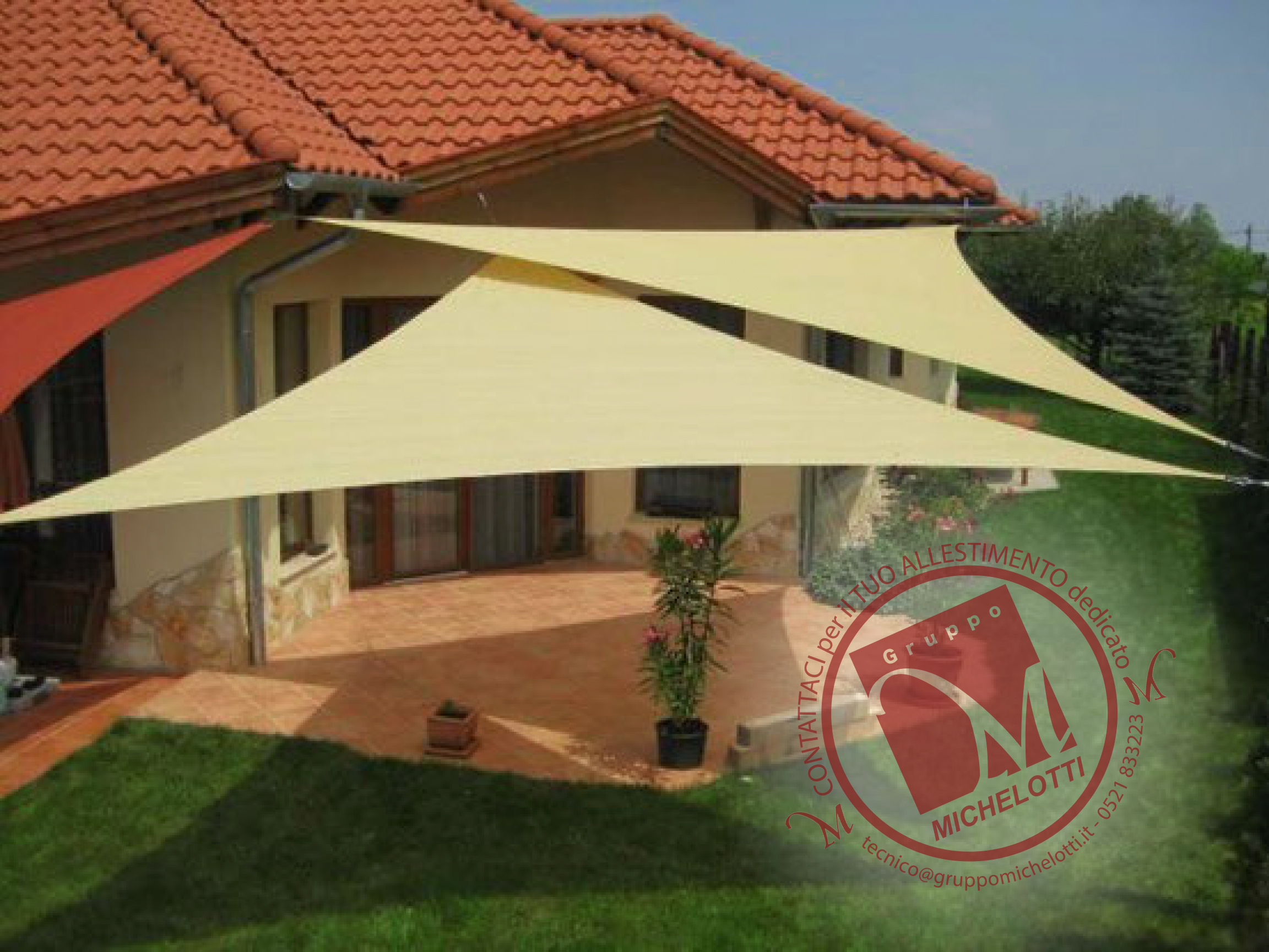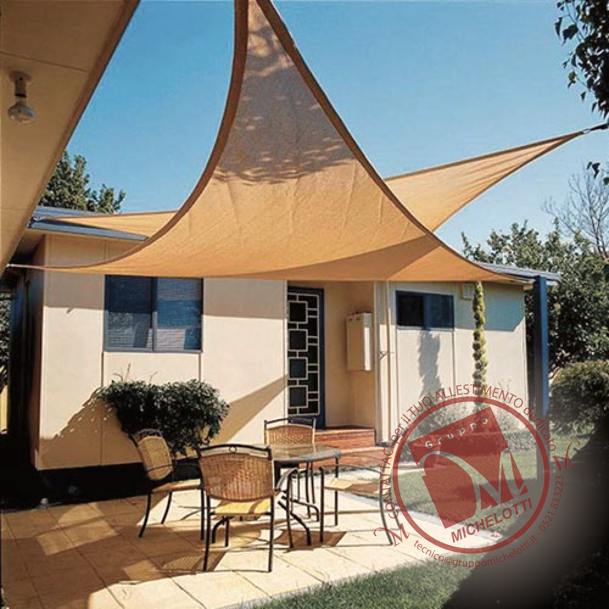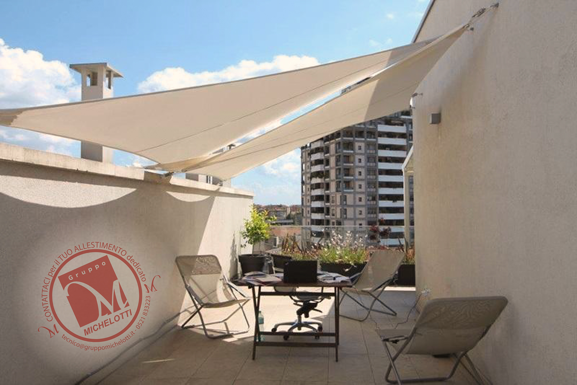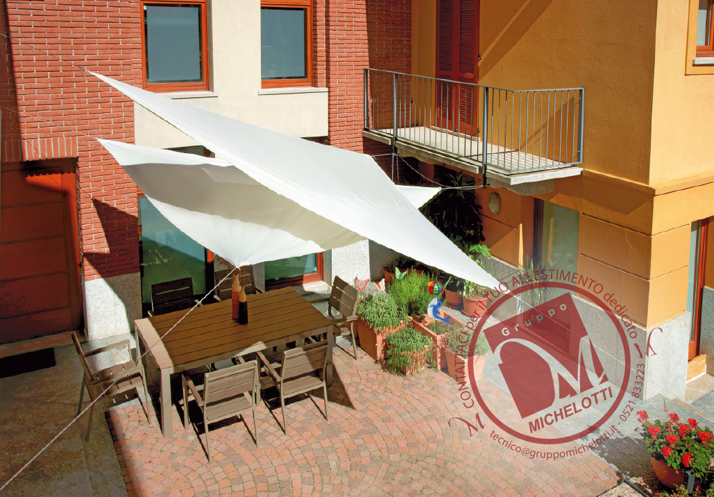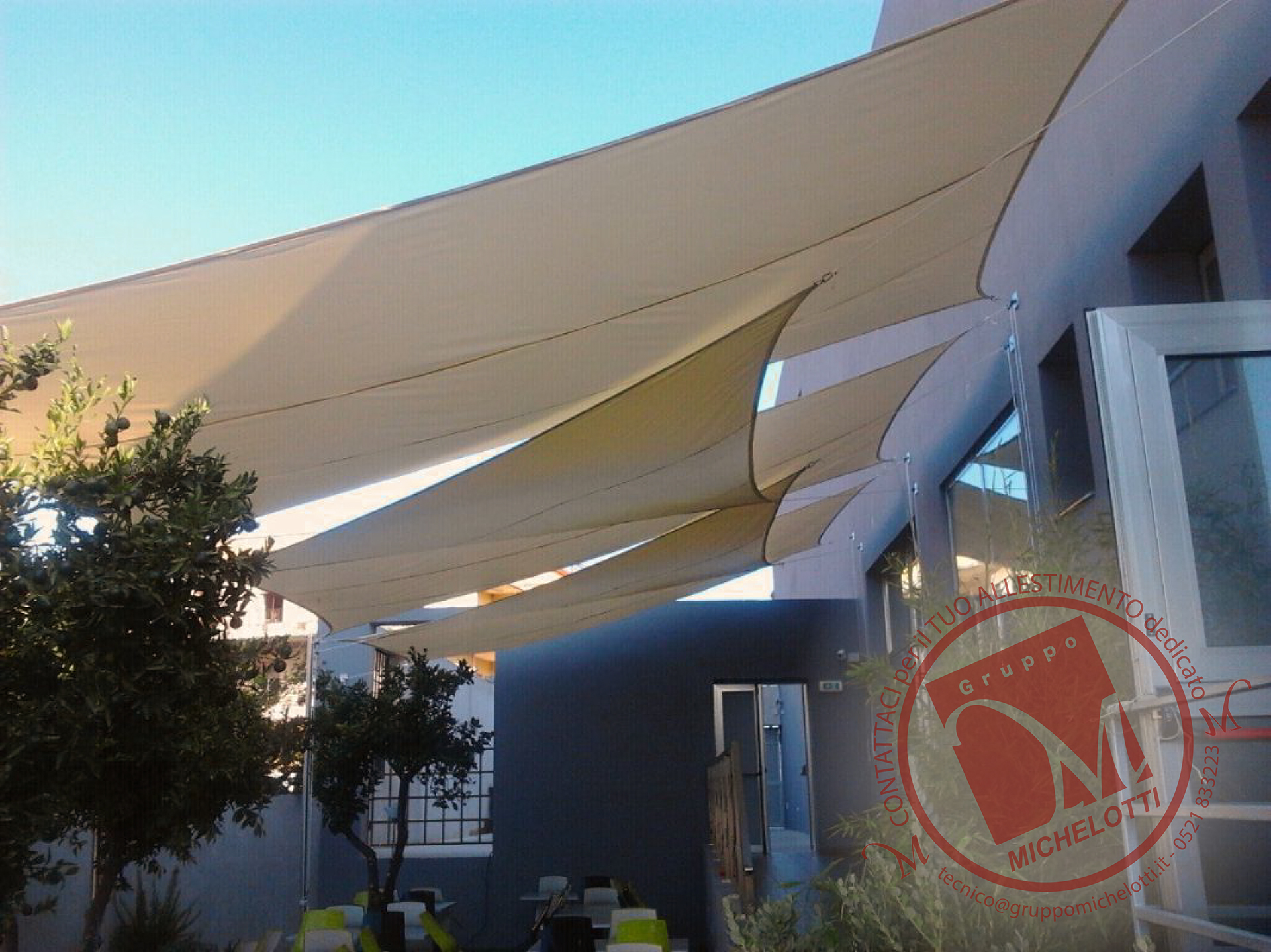 Le vele offerte dal Gruppo Michelotti sono la soluzione di maggior design e con esse è possibile creare geometrie particolari per rendere unici gli spazi anche grazie al fatto che non necessitano di ancoraggio al suolo ma possono essere appese.